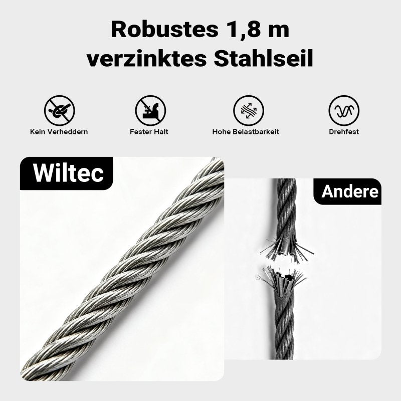 Der Wiltec Handseilzug ist ein zuverlässiges Werkzeug für das Ziehen schwerer Lasten. Mit einer beeindruckenden Traglast von bis zu 1000 kg bietet diese Handseilwinde eine ausgezeichnete Leistung für vielfältige Anwendungen. Dank der robusten Konstruktion und hochwertigen Materialien ist der Seilzug ideal für den Einsatz in Werkstätten und auf Baustellen geeignet. Der Handhebelseilzug verfügt über ein 1,8 m langes Drahtseil und ist mit zwei stabilen Sicherheitslasthaken ausgestattet. Die integrierte Bremsschnalle und das Anti-Rücklauf-Design machen die Seilwinde zu einer zuverlässigen Konstruktion für anspruchsvolle Aufgaben.