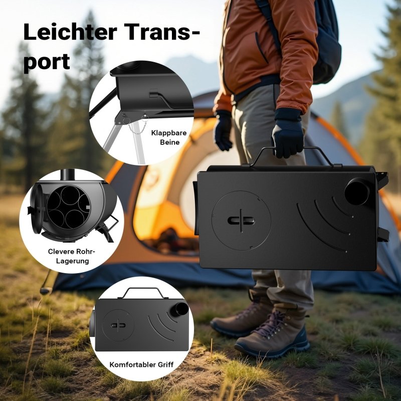 Durch seine durchdachten, kompakten Maße lässt sich der Ofen leicht aufbauen, transportieren und flexibel einsetzen. Er eignet sich ideal für kleine bis mittelgroße Zelte, Werkstätten oder temporäre Outdoor-Unterkünfte.